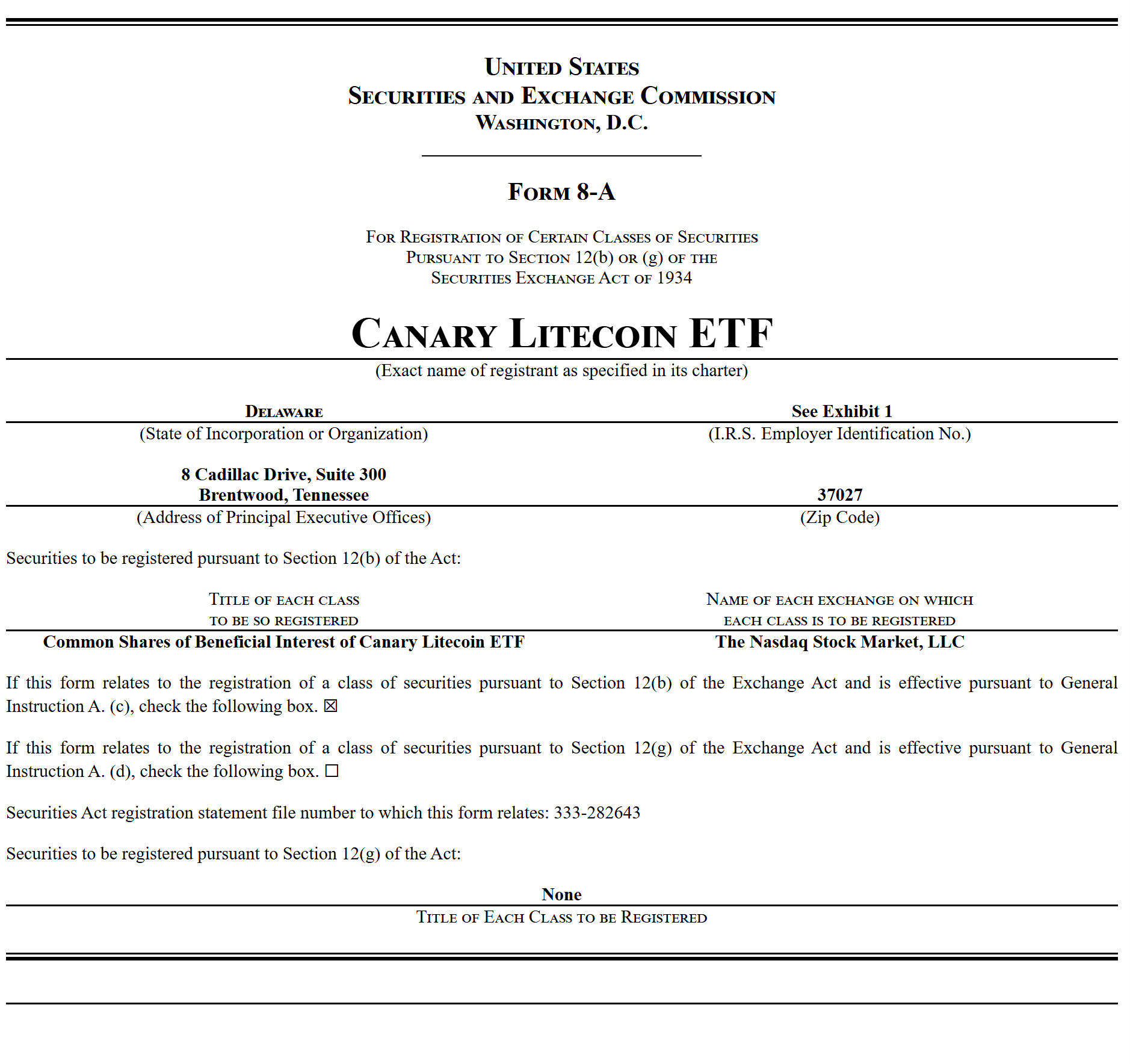 "Canary Capital已向SEC提交8-A表格,申请将Canary莱特币ETF在纳斯达克上市。这表明产品即将推出,交易很快启动。(NASDAQ:LTCC)"