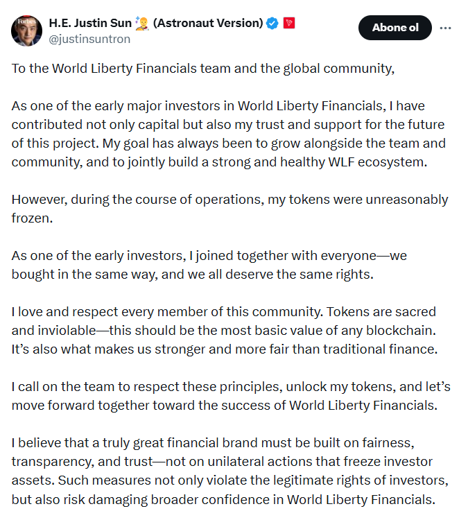 他在公开声明中强调:"作为World Liberty Financials的初始投资者,我投入的不仅是资金,更是对这个项目未来的信任。不幸的是,我的代币遭到不公正冻结。区块链的核心价值在于代币的神圣不可侵犯性,这正是我们比传统金融体系更强大、更公平的根基。"
