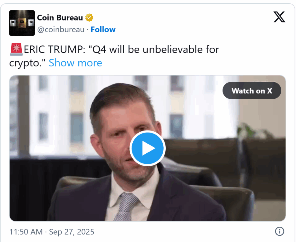 诺沃格拉茨并非唯一看好2025年第四季度比特币走势的人。埃里克·特朗普在近期访谈中透露对第四季度的高度期待。虽然未给出具体价格预测,但他对比特币突破百万美元潜力表示信心,并指出历史上第四季度通常会出现强劲的加密货币行情。