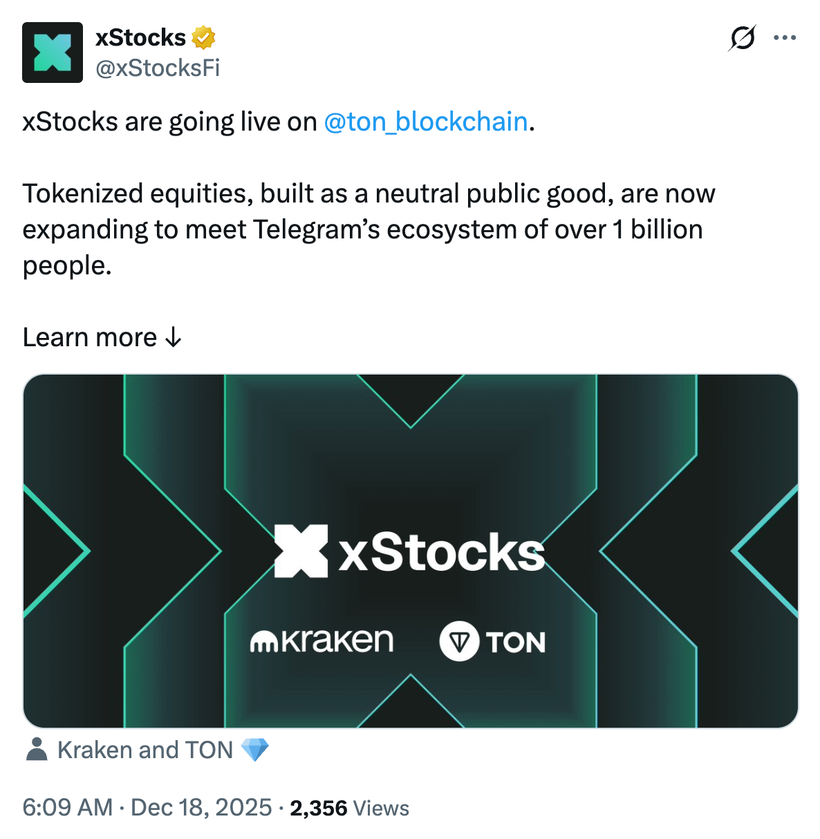 Kraken联合首席执行官Arjun Sethi在公告中表示:“将xStocks引入TON意味着代币化股权产品首次搭载于真正开放的基础设施。”他补充说明,此次发布标志着Telegram用户首次能够在链上访问代币化的美国股票。