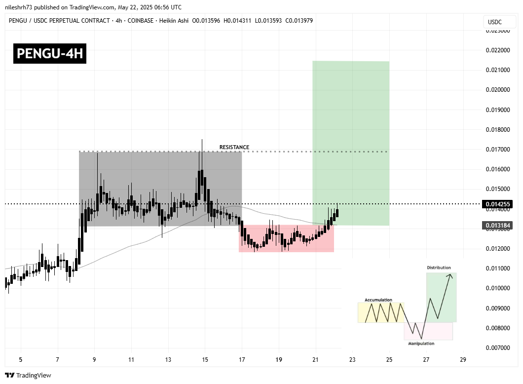 5月16日,PENGU短暂下探至约0.0118美元——这一走势很可能是为了触发止损单并吓退散户投资者。这种突然下跌是典型的“洗盘”行为,通常出现在看涨突破之前。