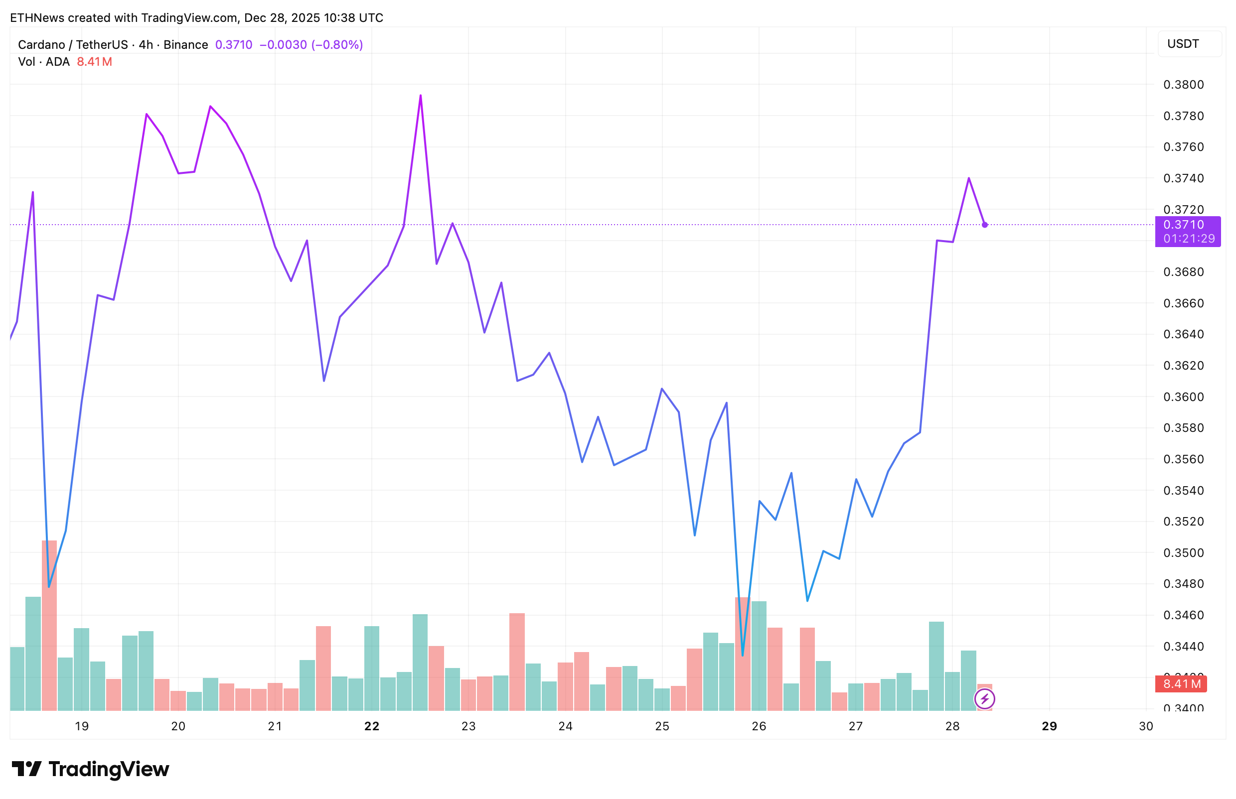 卡尔达诺(ADA)在经历剧烈下跌后正试图企稳,近期价格走势显示出有序整理而非混乱的迹象。根据最新4小时TradingView图表及技术分析,ADA现报0.37美元附近,从近期0.34-0.35美元区间的低点强势反弹。