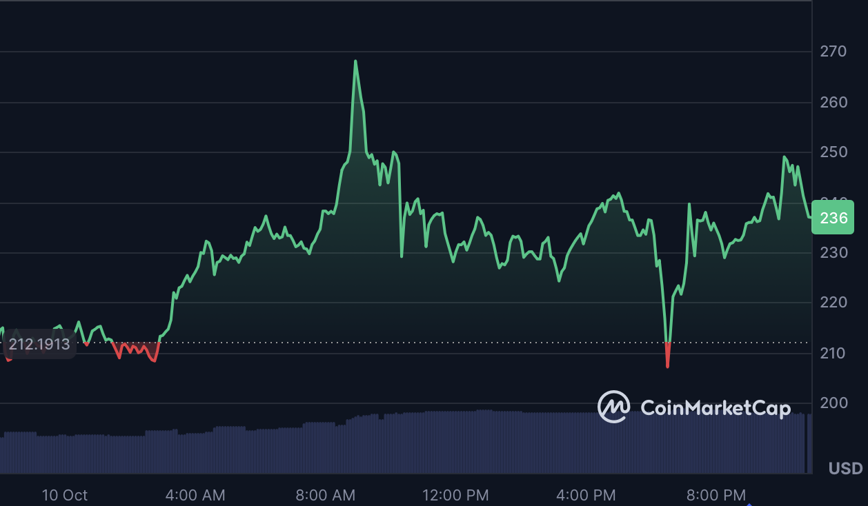 ChainOpera AI(COPAI)持续飙升,24小时内上涨19.3%,本周累计涨幅达惊人的2000%,市值推升至13.9亿美元。该项目基于BNB智能链构建,结合了AI驱动的智能体和区块链集成开发工具。其上涨动力源于在Binance Alpha和Aster Exchange(提供5倍杠杆)的上市,以及AI相关代币的整体上涨。