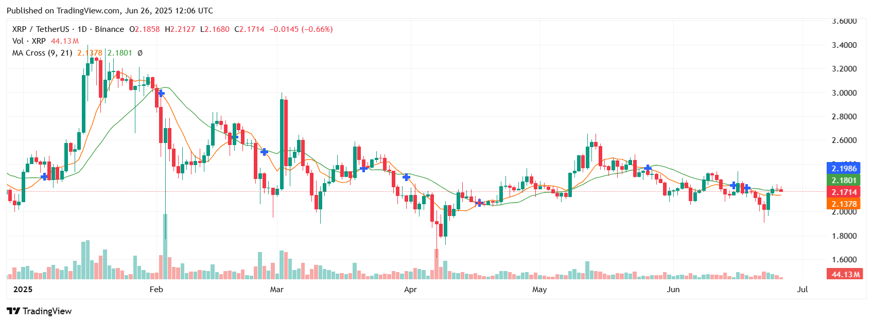 数据显示,XRP的"死亡交叉"正在延续,9日和21日移动平均线均发出看跌信号。这使得价格维持在2.14至2.19美元区间,表明该代币已在2.20美元位置形成阻力。