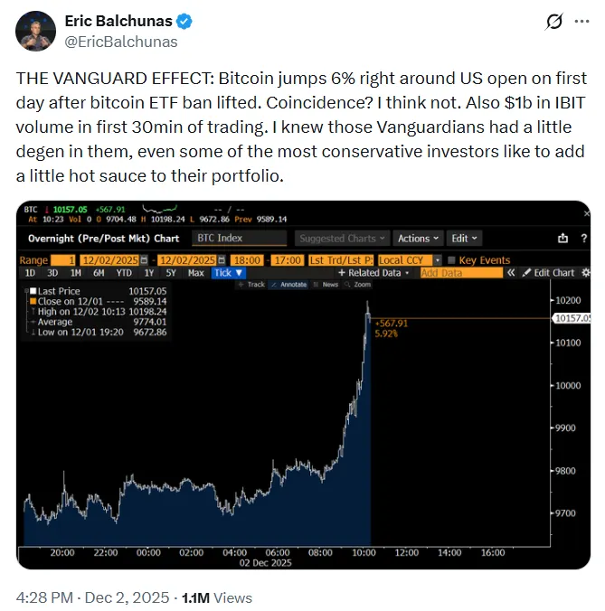 埃里克·巴尔丘纳斯指出美国交易时段开始时比特币出现剧烈波动,他将此涨势与Vanguard的新政策相关联。其在X平台发文透露,IBIT在开盘前三十分钟内成交额约达10亿美元,并补充说明比特币在此期间涨幅接近6%。