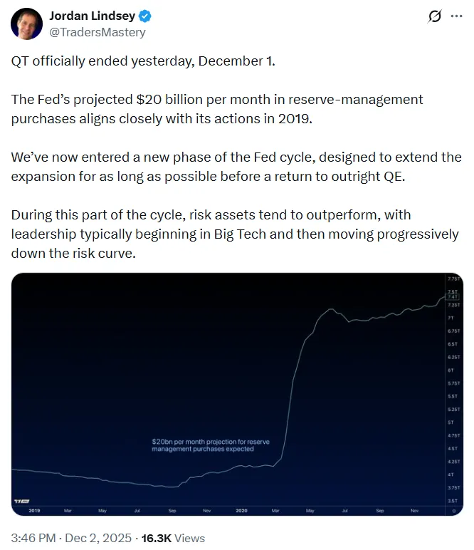 推动今日加密货币市场上涨的另一因素是关于美联储政策转变的讨论再度兴起。知名分析师乔丹·林赛在近期发文中透露,该行已于12月1日结束量化紧缩政策,当前阶段将转向储备管理。林赛进一步指出,美联储预计此阶段每月购债规模约200亿美元,并将其与2019年的操作相类比。