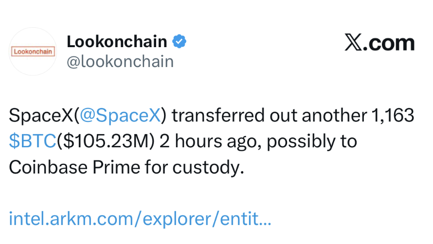 SpaceX于2025年11月27日将1,163枚比特币(价值1.05亿美元)转移至新钱包。区块链公司Arkham Intelligence追踪到这笔从休眠钱包转入与Coinbase Prime关联地址的交易。分析师认为这是托管架构重组而非抛售行为。