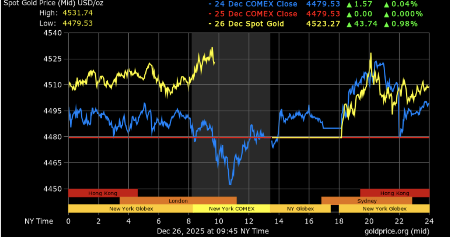 黄金仍然是代币化大宗商品扩张的主要推动力,其价格坚挺在历史高位附近。根据图表数据,现货黄金目前价格约为每盎司4,525美元,此前盘中曾接近4,532美元高点,并在4,480美元附近找到支撑。金价持续保持在4,500美元门槛之上,这一水平已成为重要的心理支撑位,强化了当前上涨趋势的力度,而非预示着短暂的价格飙升。
