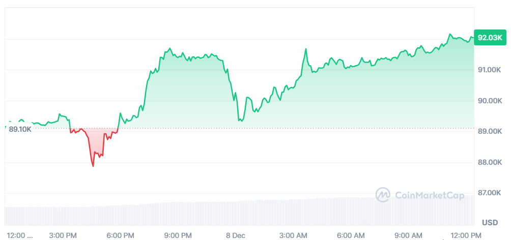 12月8日,比特币价格在乐观市场情绪中重新站上92,000美元关口。过去24小时内,加密货币市场整体上涨近3%。本周对加密行业至关重要,因为联邦公开市场委员会(FOMC)会议将于12月10日举行,美联储将就美国潜在降息决策做出表态。