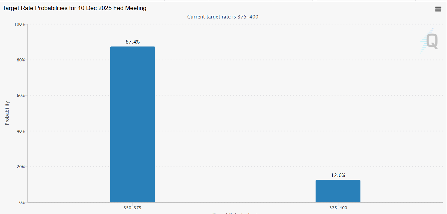 根据CME集团数据,市场预计美联储本周有87.4%概率降息25个基点。