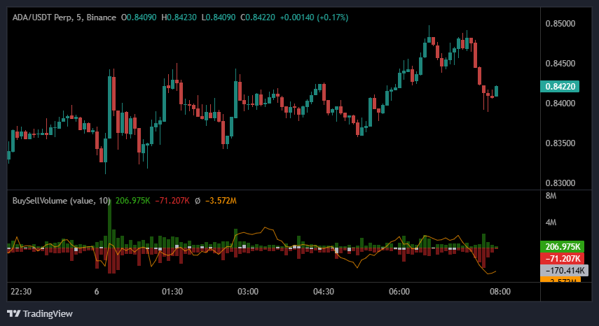 币安5分钟图表显示,ADA现报0.842美元附近,日内微涨