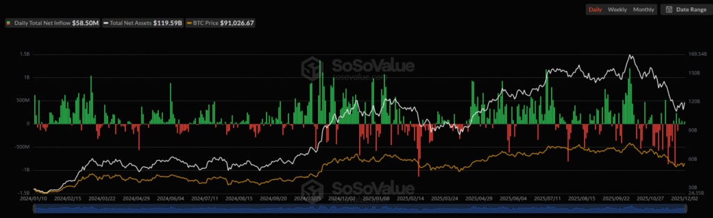 12月2日(东部时间),比特币现货ETF实现5850万美元净流入,标志着该类资产连续第五日获得资金注入。资金持续流入比特币ETF的趋势,反映出机构投资者对该资产的长期关注。