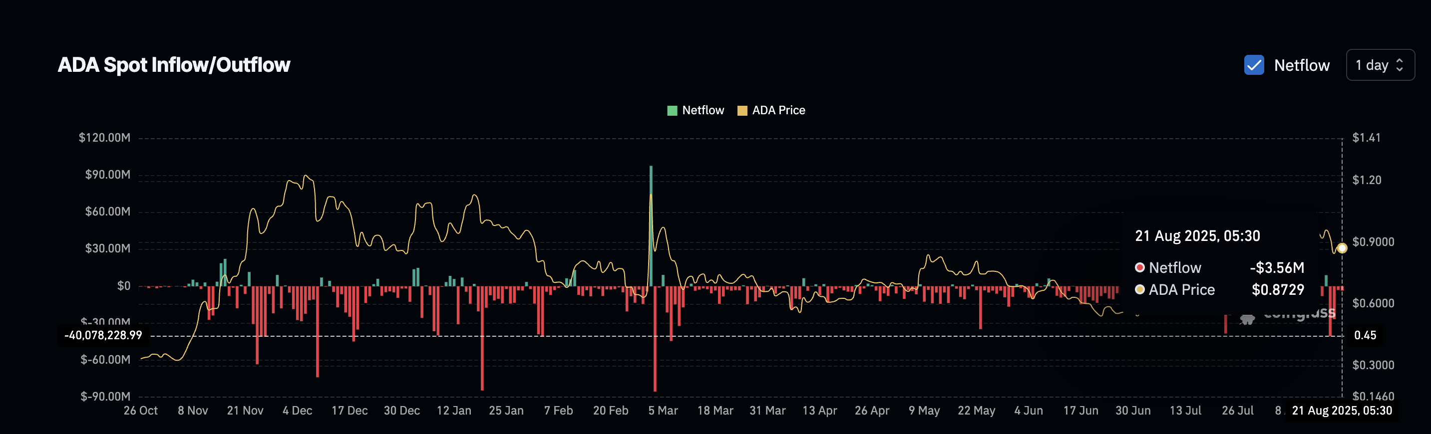 这种信心正在消退。截至8月21日,ADA净流出骤降至仅356万美元,较峰值需求下滑91%。虽然仍保持净流出状态,但规模锐减表明买方正在退场——尽管尚未出现积极资金流入,但上涨动能已然停滞。