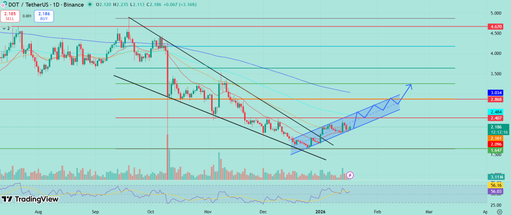 反转后的波卡开始在上升通道内构筑更高高点,这一走势推动价格突破2美元关口。自1.80美元需求区反弹以来,短期均线系统已转为上行,动量指标同样释放积极信号。只要价格稳守2美元支撑区,看涨结构就依然有效,若能突破2.30美元阻力,近期将有望打开通往2.80美元乃至3.20美元的空间。