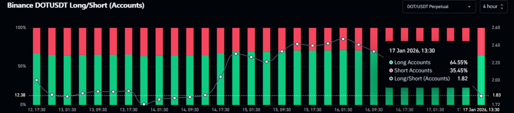 Coinglass数据显示市场多空力量对比明显倾斜,截至发稿时DOT多空比达1.82,凸显看涨预期。但需注意2.28美元附近存在价值78.6万美元的空头集中清算区。