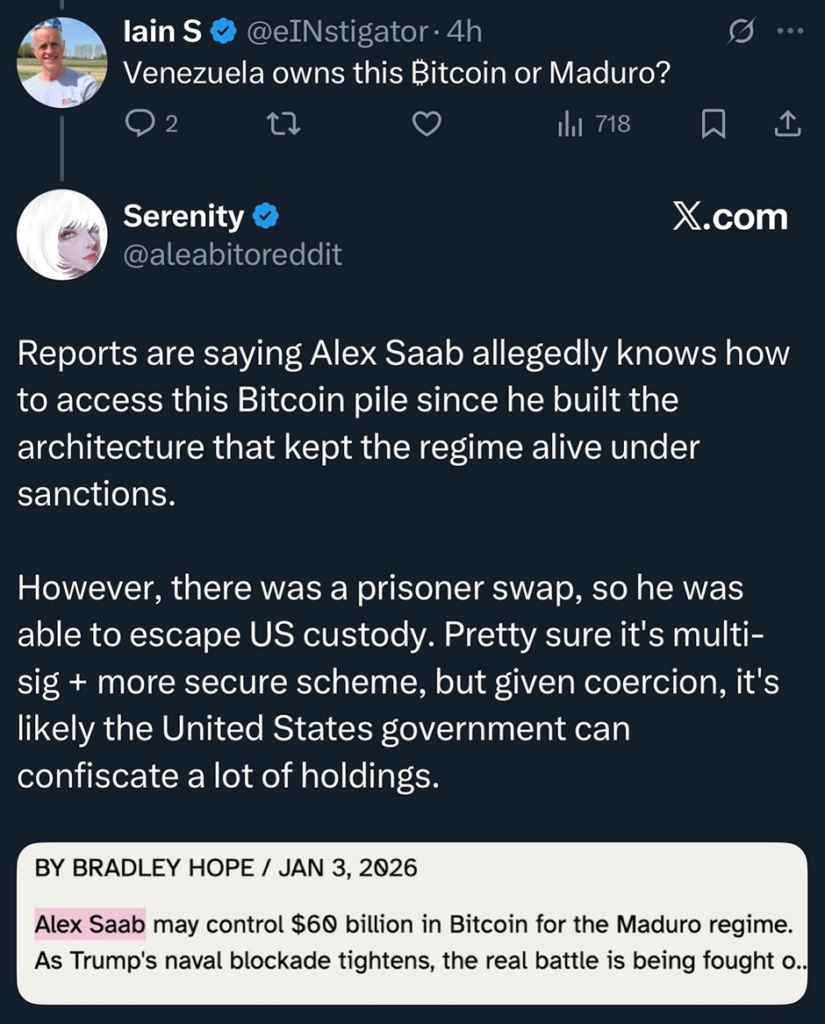 控制权比总量更重要。即使比特币存在,也可能不由委内瑞拉政府直接持有。报告表明,访问权限可能掌握在一小部分内部人士和中介手中。常与此角色关联的一个名字是亚历克斯·纳恩·萨阿布·莫兰,他是尼古拉斯·马杜罗的亲密盟友。
