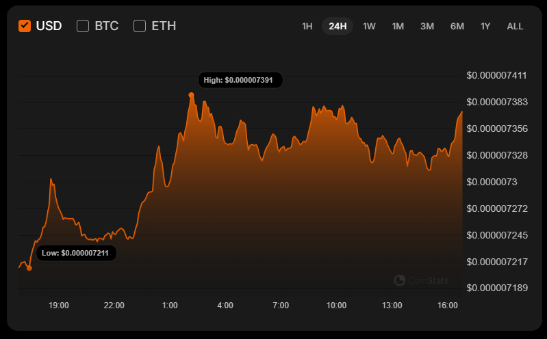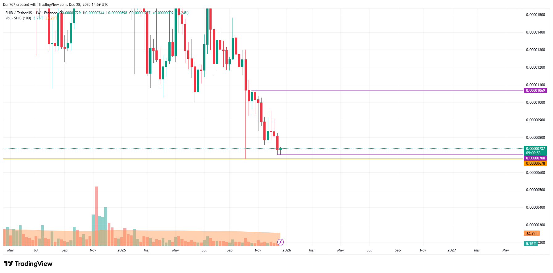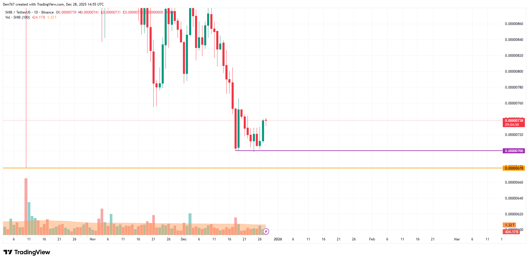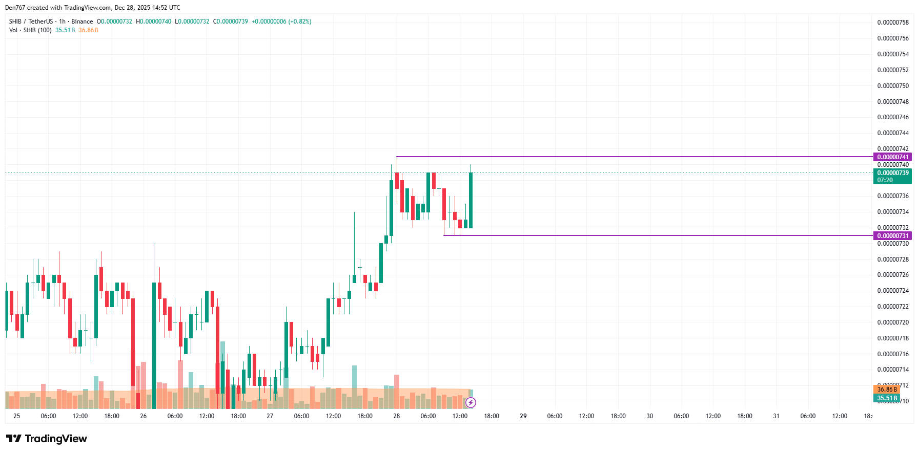 从更大时间框架观察,SHIB价格与关键水位仍有距离。此时交易者应重点关注昨日K线高点。若收盘价站稳0.00000740美元上方且带长上影线,未来几日可能测试0.00000770美元区域。