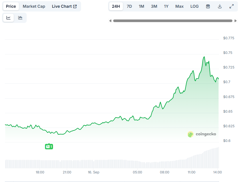 IMX价格两位数飙升,可能受过去24小时加密货币市场表现平淡,多数主流数字资产价格波动微弱。然而,Immutable(IMX)逆势上涨12%,一度冲高至0.75美元,创下今年5月以来新高。随后几小时小幅回落至当前0.70美元水平(数据来源:CoinGecko)。