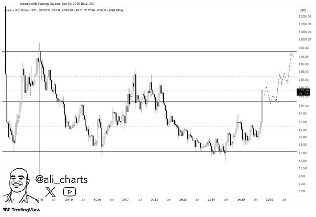 另一位知名分析师Ali认为Zcash仍有上涨空间。其图表显示上方存在两个关键阻力位:首先是290美元附近,随后是650美元左右的更强阻力。