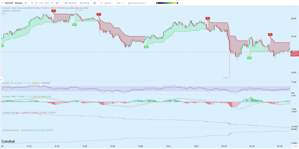 图表显示SOL目前徘徊在185美元附近,价格走势呈现震荡无方向态势。本月早些时候超级趋势指标转熊,预示下行压力持续。每次突破尝试失败后形成更低的高点,显示买方动能正在衰竭。