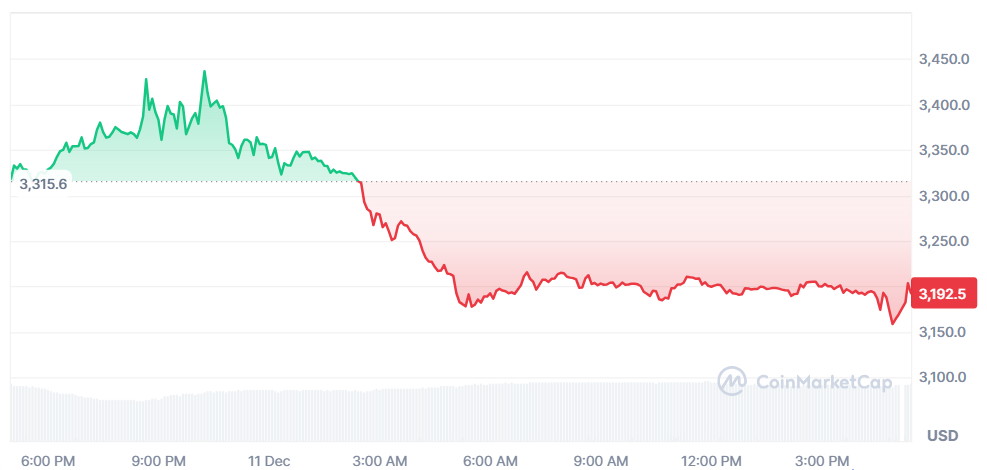 ETH价格从12月10日的3,436美元下跌,一度跌破3,164美元低点,随后反弹至当前水平。