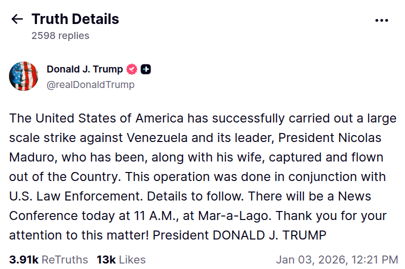 在美国对委内瑞拉首都加拉加斯发动空袭的消息传出后,总统唐纳德·特朗普在Truth Social上发布声明,称委内瑞拉总统已被俘并“用飞机带离该国”。