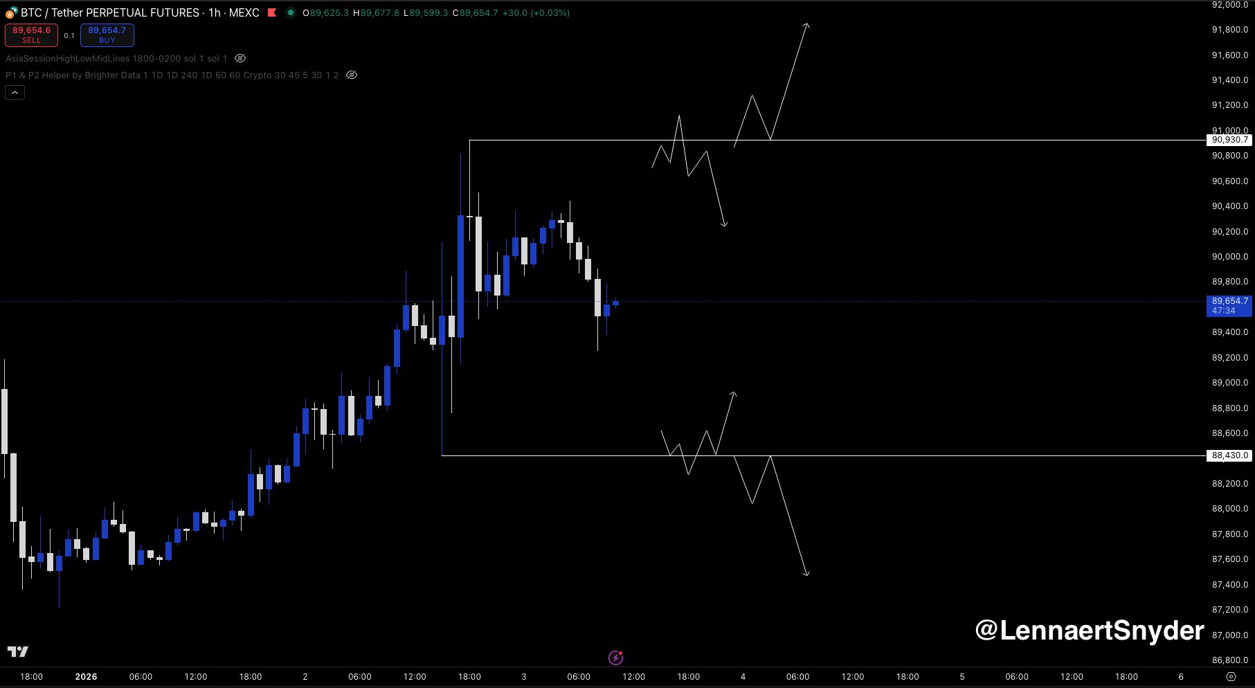 与此同时,加密货币交易员、分析师兼企业家Michaël van de Poppe将比特币的最新走势描述为典型的委内瑞拉事件反应,并保持看涨观点。“1月份的方向很明确:只要比特币维持在21日移动均线上方,我们就继续看涨,”他总结道,此处指的是位于87,850美元的21日简单移动平均线。