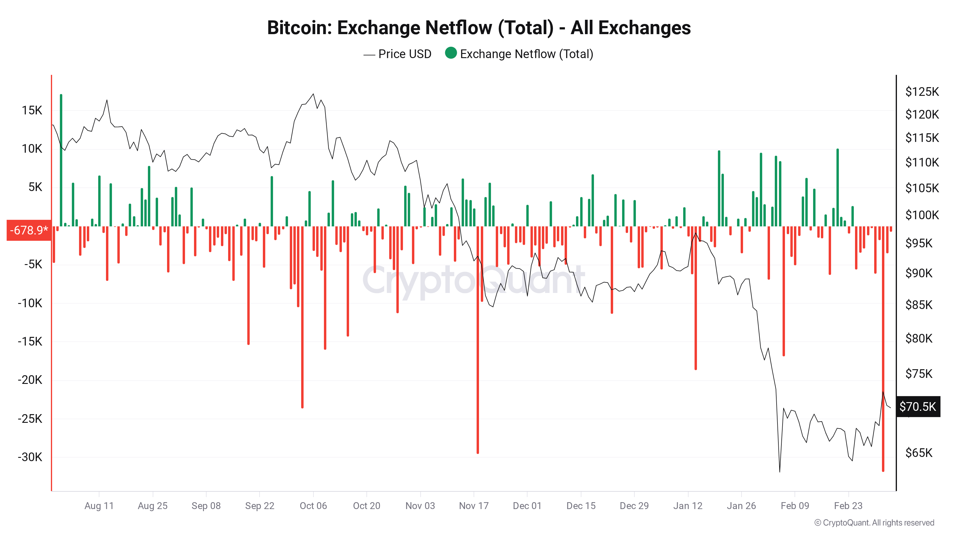 Adler指出:“本周总流出量达到约47,700枚BTC——这是过去一年中单周流出最高的记录之一。3月4日的峰值(-31,900枚BTC)属异常情况:此类规模的单日事件通常与大量持仓转移至冷存储相关,尽管部分流出可能反映托管机构内部资金调动。”