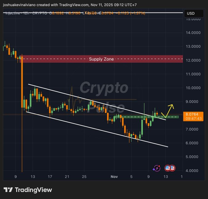 Injective(INJ)在7.8-8.0美元区间重新测试突破位,显现初步复苏迹象。在经历数周持续下行压力后,市场参与者正密切关注该区域能否形成有力支撑。