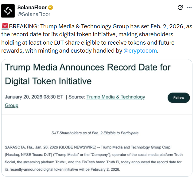 根据公司周二发布的公告,该记录日(即"快照"日)意味着,截至2月2日持有至少一股特朗普媒体公司股份且具有"受益所有人"或"登记持有人"身份的投资者,均有资格获得不可交易的数字奖励代币。公司表示,在记录日之后将委托加密货币交易所Crypto.com负责代币铸造、区块链公示及托管事宜,直至完成向股东的分发。