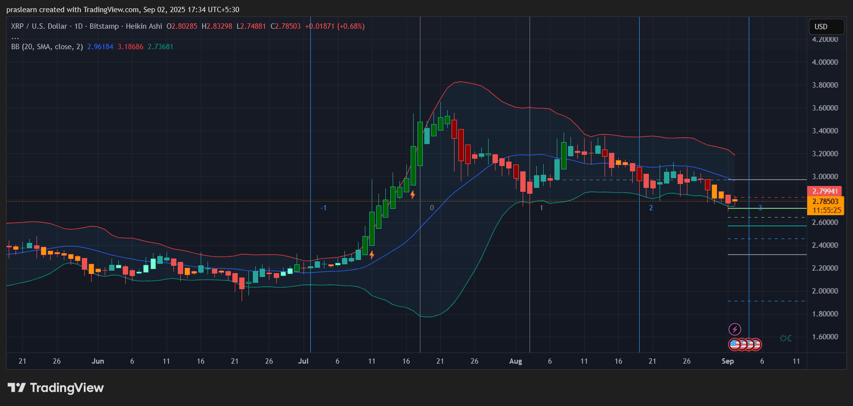 XRP/USD日线图显示,该币种在7月强劲反弹后持续走低,8月至9月初维持下行趋势。现价2.78美元已跌破布林带中轨(2.96美元),释放看跌信号。蜡烛图在下轨(2.73美元)附近持续收窄,通常预示下跌延续或即将反转。