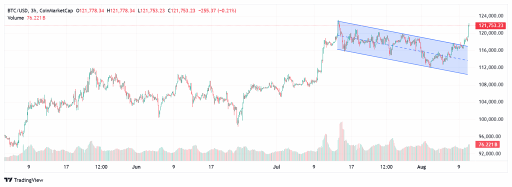 截至发稿,BTC价格上涨3.3%至122,075美元,24小时波动区间为117,519-122,309美元。同时交易量增长28%,显示市场参与度显著提升。