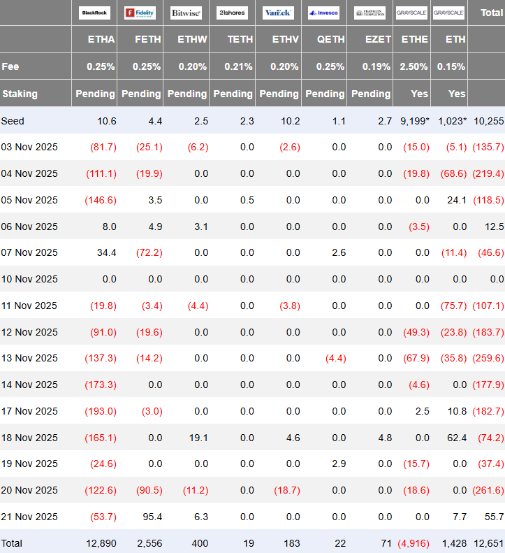 过去一周以太坊ETF资金流动仍以流出为主导,与困扰市场的巨额流动性外流态势一致。但周五ETF数据显现转折迹象——这是否预示着市场即将迎来喘息之机?十一月正成为以太坊ETF资金流最疲软的月份之一,过去五日净流出额突破5亿美元关口。