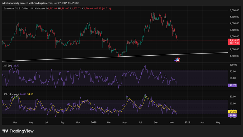 ETH相对强弱指数一度下探至27,创今年四月以来首次超卖纪录。这种超卖状态可能促使巨鲸与机构资金回补仓位。但ETH能否维持涨势,仍取决于需求能否有效抵消现有抛压。
