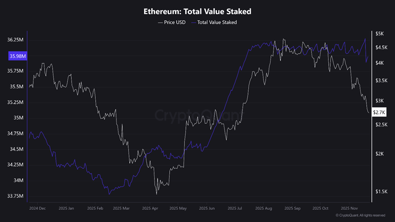 自八月开始的熊市环境已导致以太坊等主要区块链出现严重流动性外流,这与质押总价值(TVL)的急剧下滑形成呼应,反映出投资者信心流失。作为参照,以太坊质押总量在八月达到3611万ETH的峰值,创12个月新高,目前已回落至3590万ETH。