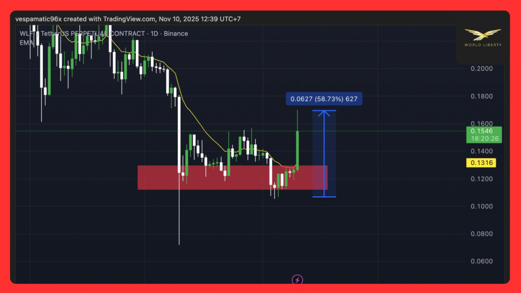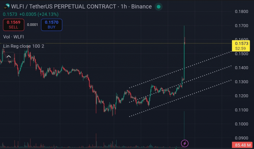 WLFI价格24小时内上涨58.73%,最高触及0.1619美元。Vespamatic96披露的链上数据显示,本轮行情由1.2亿美元巨鲸买单启动。价格异动恰逢币安1小时与4小时图表趋势反转,代币成功突破看涨通道及阻力区域。
