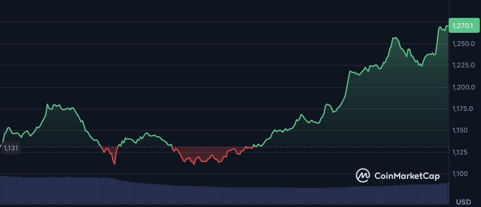 根据CoinMarketCap数据,币安生态原生代币BNB在过去24小时内强劲反弹,涨幅超10%,现报1270美元。此次上涨源于加密货币市场的整体复苏,中美贸易紧张局势缓和以及上周暴跌后投资者信心重振共同推动了这波行情。