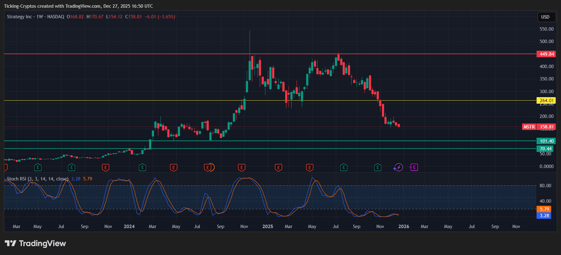 MicroStrategy股价走势清晰反映了这一风险。MSTR在触及主要阻力位高点后已进入强烈下跌趋势;关键支撑位相继失守;股价目前远低于历史高点,与比特币的弱势形成呼应