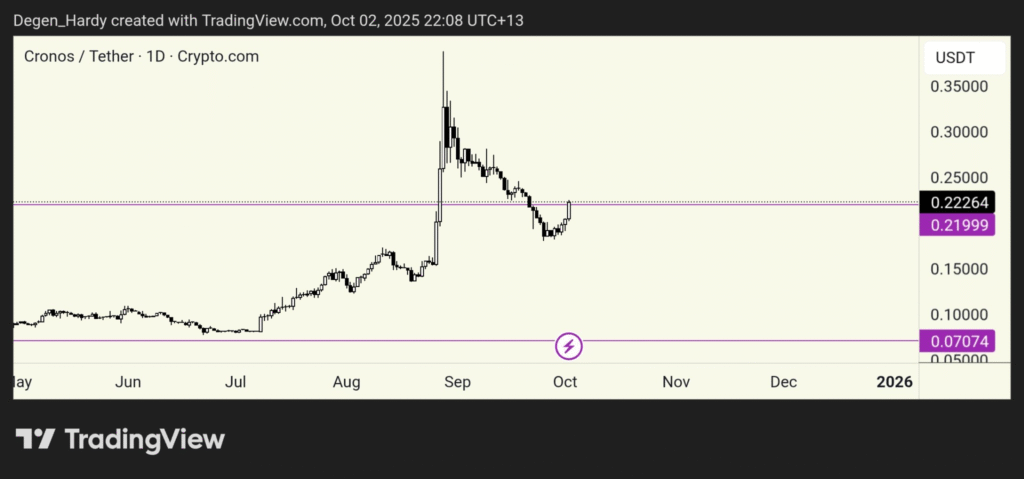 Cronos ($CRO) 近期呈现显著上涨态势,在突破关键趋势线后完成回踩确认并持续走高,显示出强劲的多头行情。该加密货币过去24小时涨幅达10%,市场分析师对其增长前景普遍乐观,部分人士甚至预测到10月底前可能实现347%的价格涨幅。