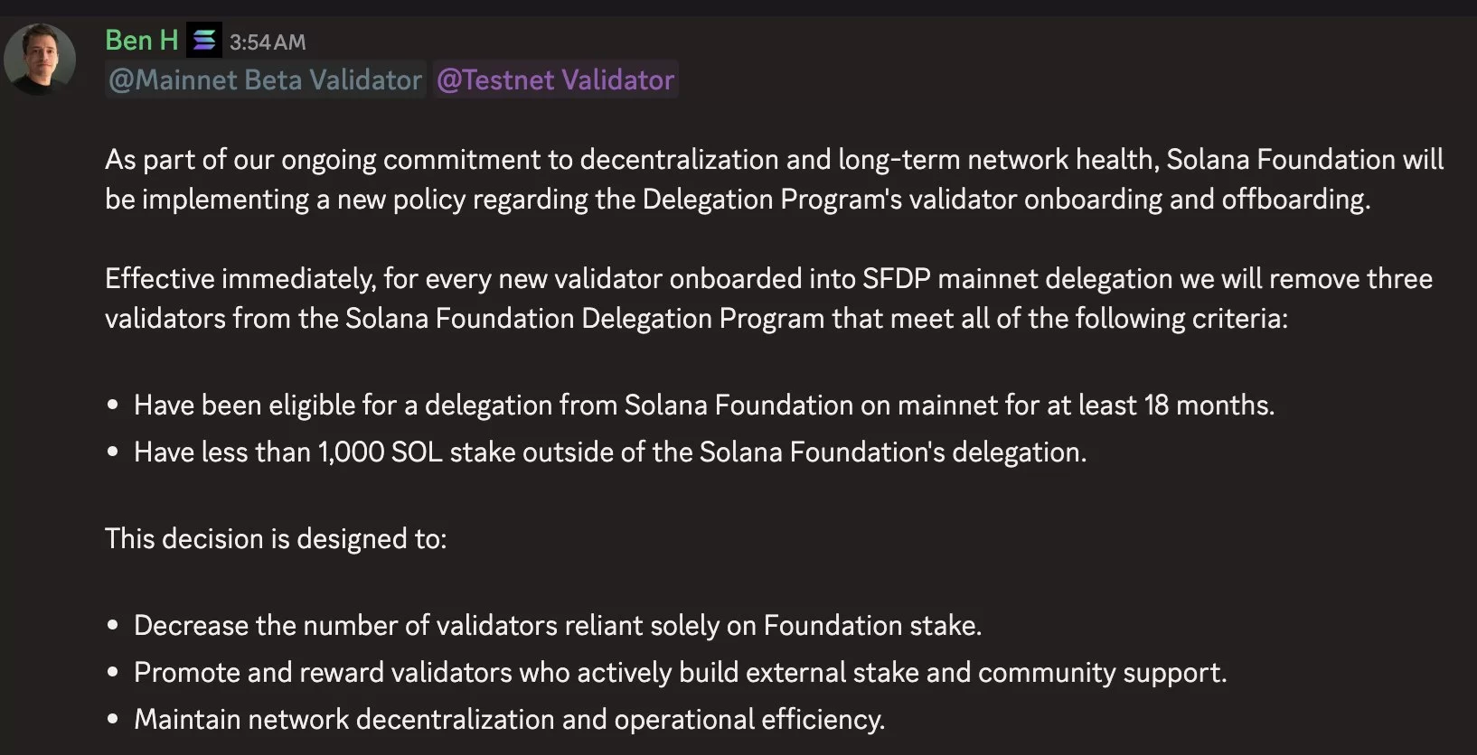 根据新政策,每向Solana基金会委托计划(SFDP)添加一个新的验证者,将移除三个符合条件的现有验证者。这些条件包括:参与计划至少18个月,且在基金会支持之外的外部质押资产少于1,000 SOL。这意味着长期参与计划且资产较低的验证者将被持续替换。