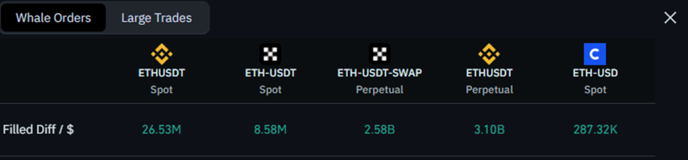 具体而言,过去两天内,以太坊鲸鱼在币安、OKX和Coinbase上贡献了超过5500万美元的净现货资金流入。同期,这些鲸鱼还执行了超过56亿美元的净多头头寸。