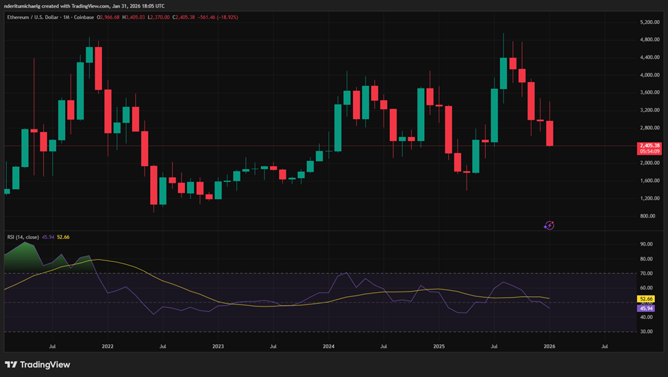这表明鲸鱼预期在本周看跌的价格走势后会出现短期复苏。以太坊(ETH)价格从其周开盘价暴跌超过14%,至发稿时的2,399美元。此价格也意味着较其一月份开盘价下跌了19%,这是其连续第五个月收跌。