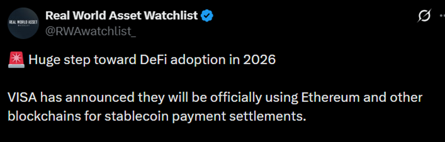 现实世界的应用一直在加速,并有望成为2026年的关键增长动力。许多传统金融公司已表示有兴趣采用区块链技术,主要通过资产代币化的形式。
