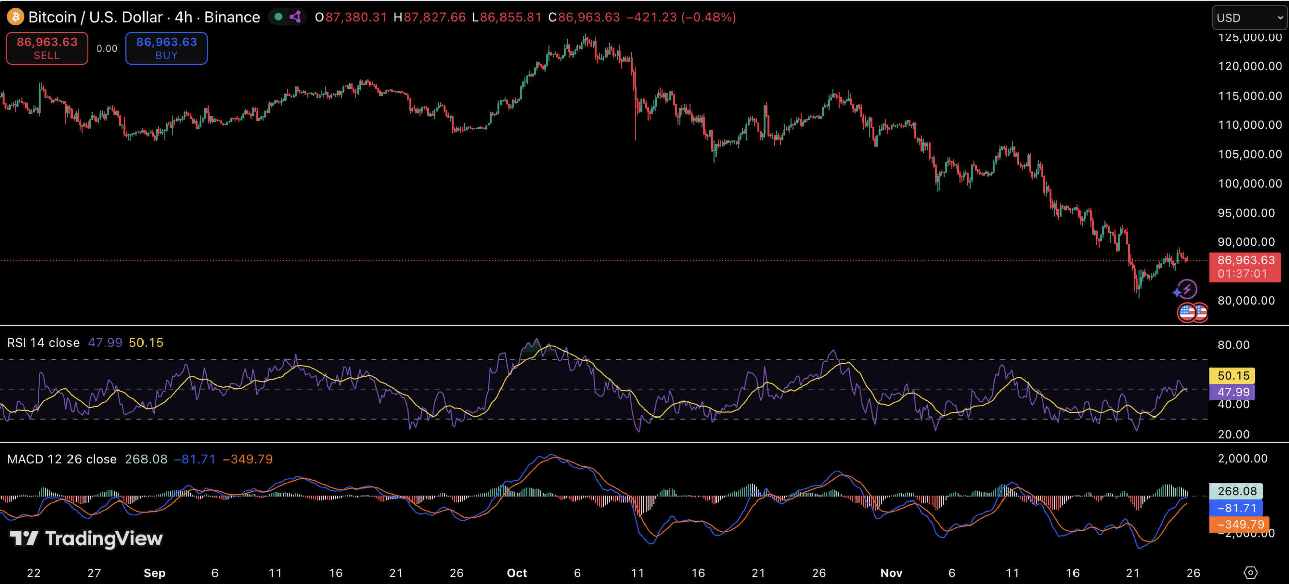 比特币在触及11月低点后反弹至87000美元附近,但技术面趋势仍偏向看跌。