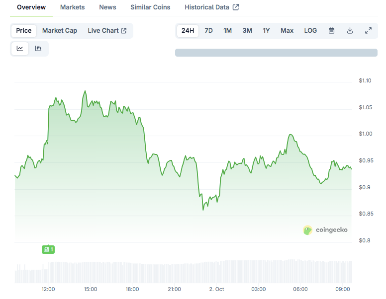 CoinGecko数据显示,XPL现价0.9472美元,日交易量27.2亿美元,24小时涨幅4.43%。短期数据虽显示复苏,但市场仍在权衡创始人声明与链上可见的交易行为。