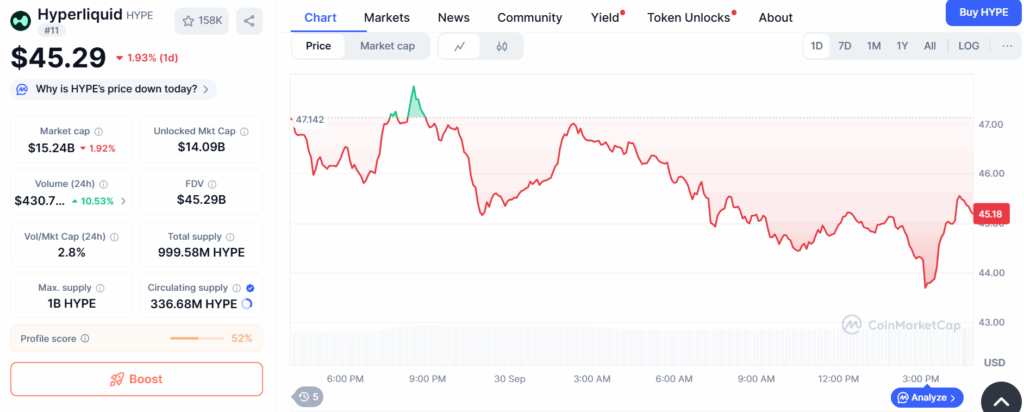 尽管近期价格下跌,但该钱包仍实现盈利。截至撰稿时,Hyperliquid代币价格为45.29美元,24小时下跌1.93%,7日跌幅5.19%,但月涨幅为2.6%。