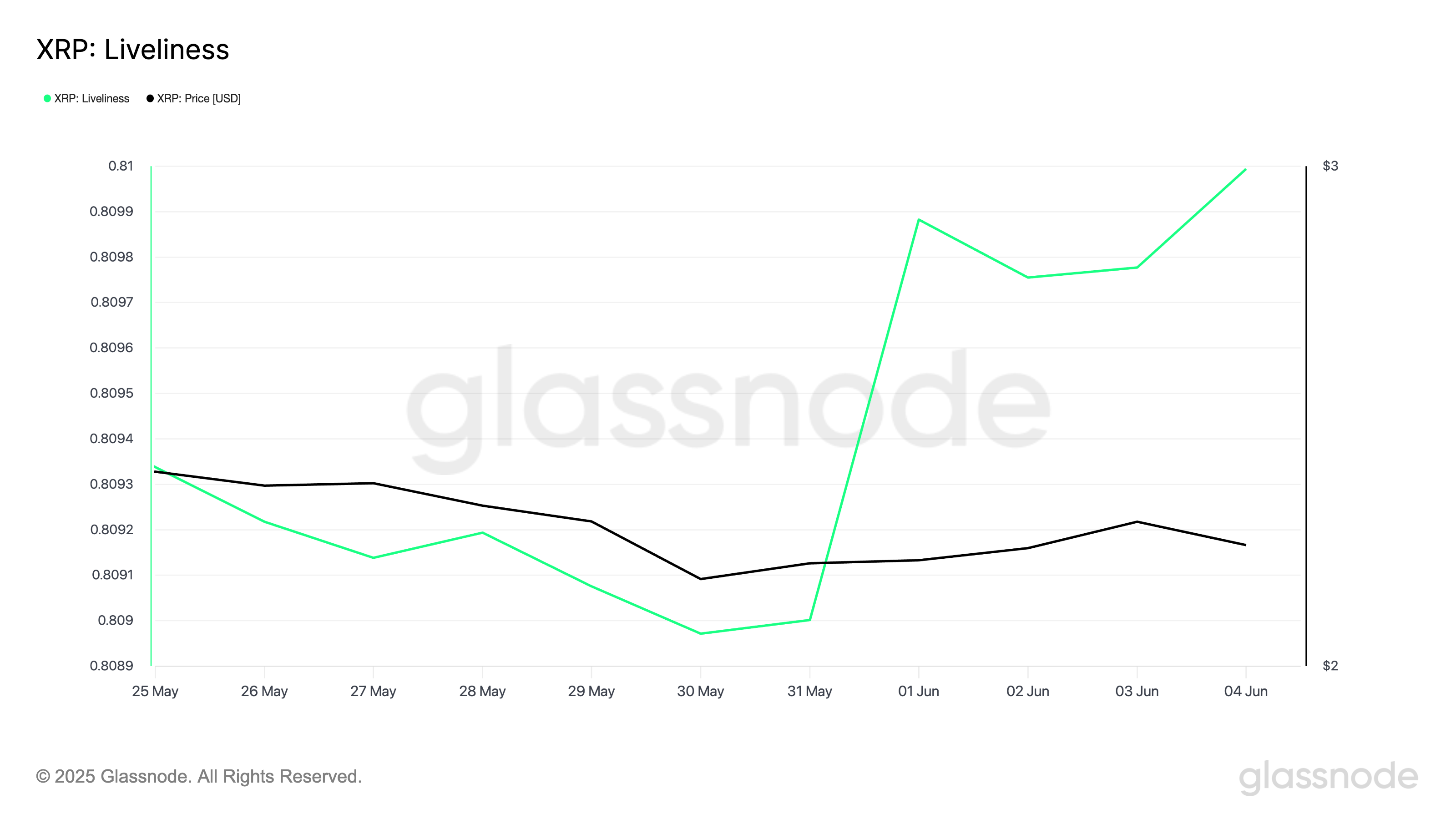 随着价格回升,XRP活跃度指标自6月起同步攀升,表明长期持有者正在借机减持。根据Glassnode数据,该指标6月3日收于0.809。