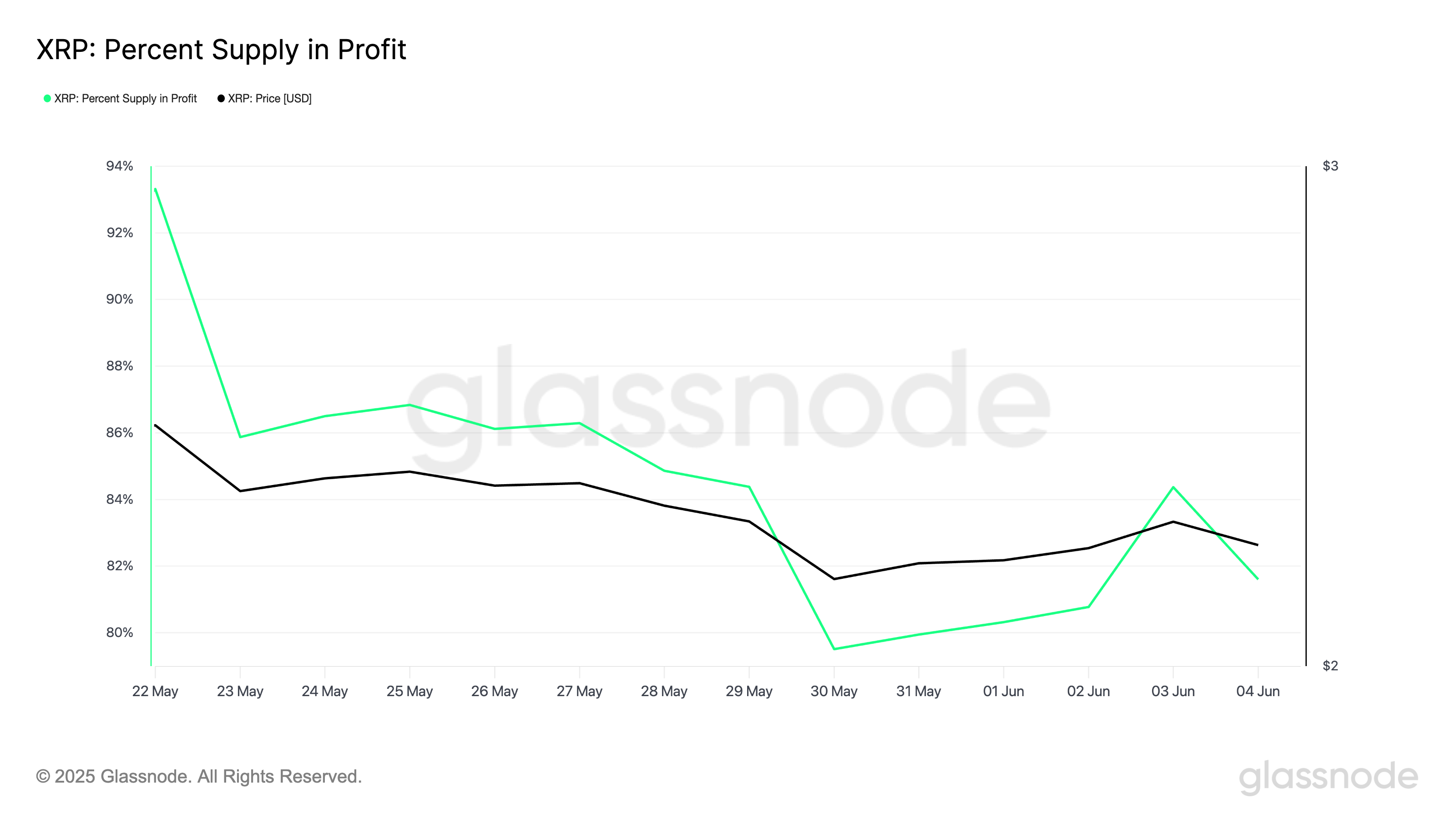 值得注意的是,这种转变主要源于近期XRP盈利供应量回升——截至发稿时,82%的XRP持有者处于浮盈状态(5月31日曾跌至79%的多月低点)。当更多交易者处于盈利状态时,抛售动机便会增强。