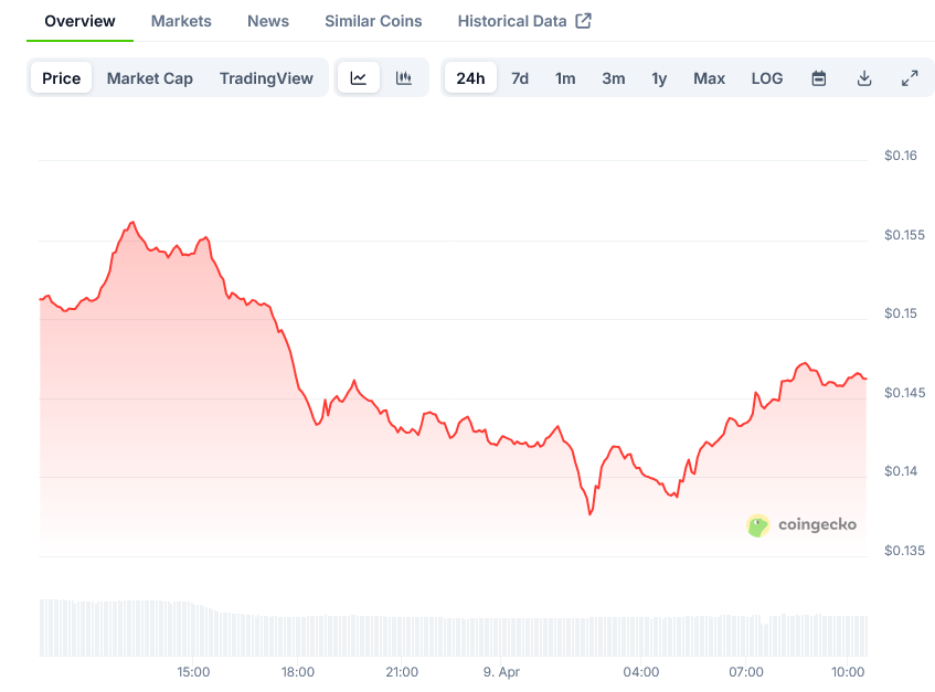 对DOGE价格走势的技术分析揭示了多个令看涨投资者担忧的指标。在DOGE/USD对的小时图上,已形成一条阻力位在0.16美元的看跌趋势线。MACD指标在熊市区域持续获得动能,而RSI仍低于中性50水平,表明买盘压力较弱。