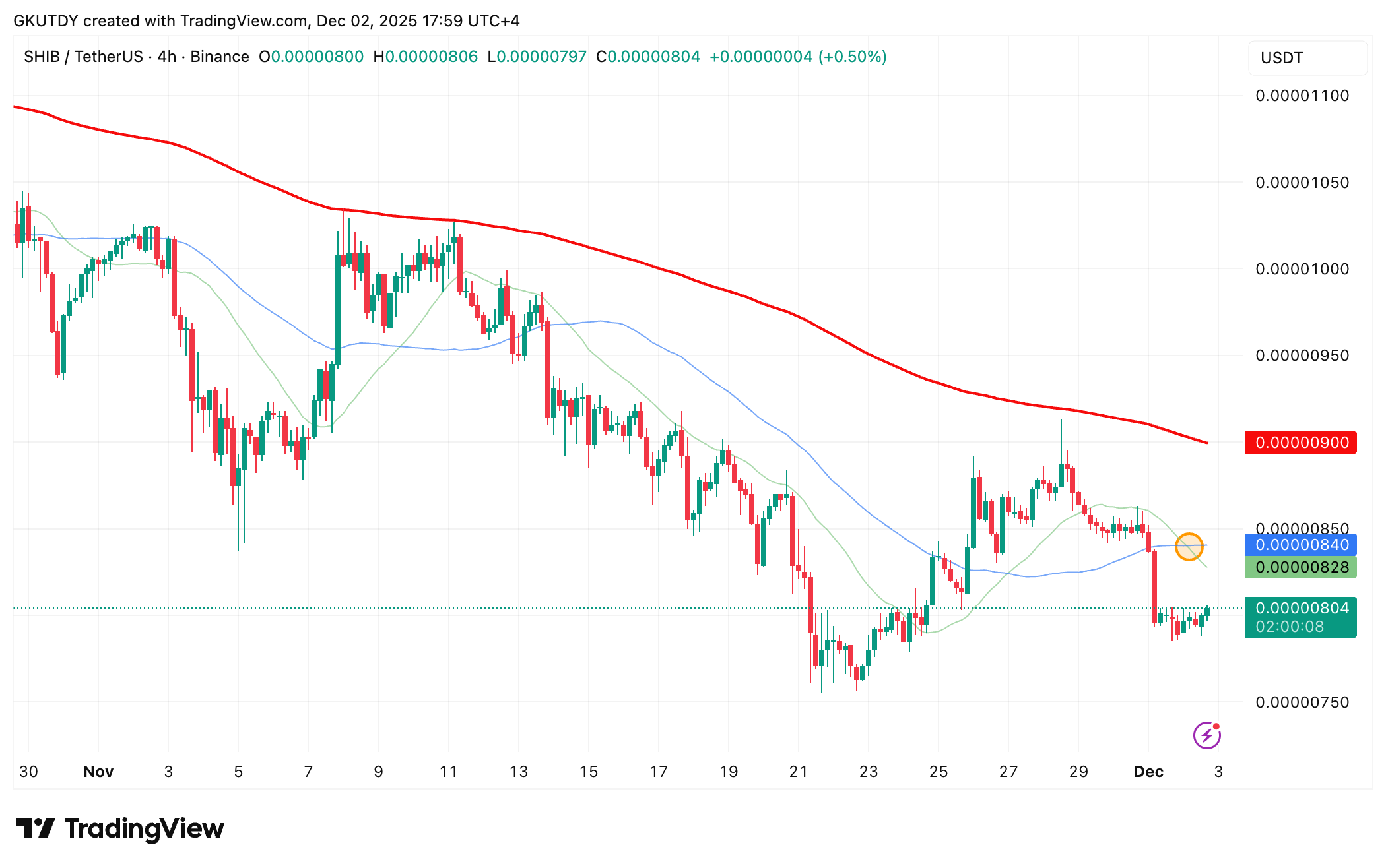 根据TradingView价格图表显示,流行 meme 加密货币Shiba Inu (SHIB)在12月很快迎来了首次死亡交叉——就在今天,这一不祥模式出现在四小时图上。随着23日均线下穿50日均线,SHIB再次确认了看跌趋势。事实上,过去数日、数周甚至数月以来,这一趋势始终主导着其价格走势。